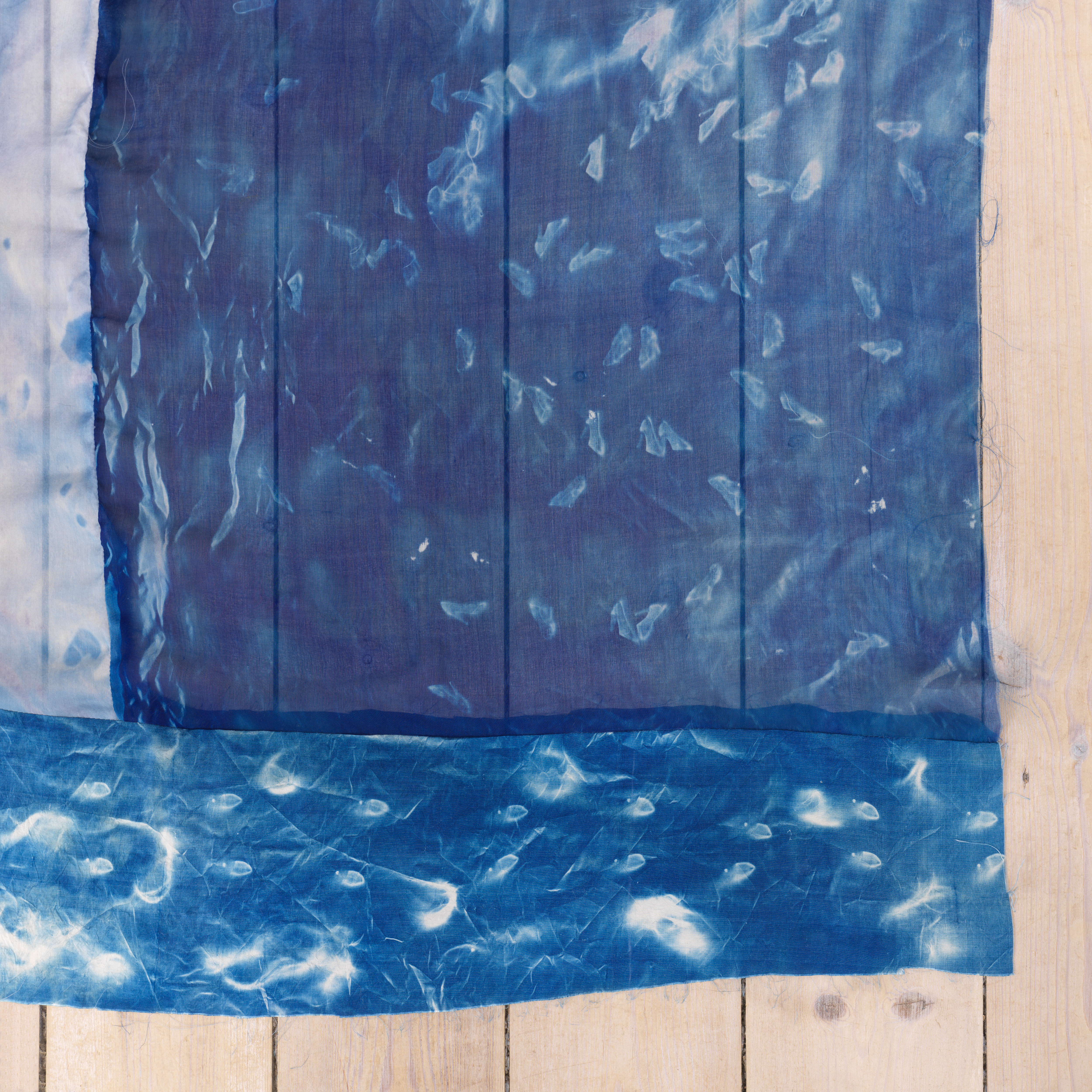 cyanotype on chiffon silk, 15 minutes artificial exposure 127.0 x 141.5 cm